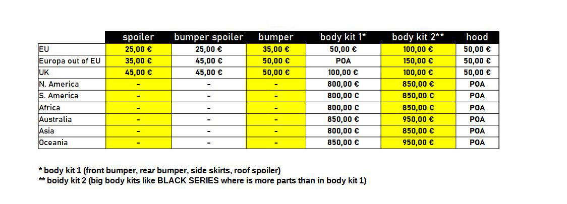 Full Body kit contains: - Front Bumper - Rear Bumper - Side Skirts - Front Wheel Arches - Rear Wheel Arches - Hood - Fog Lights We highly recommend installations are completed by a professional...